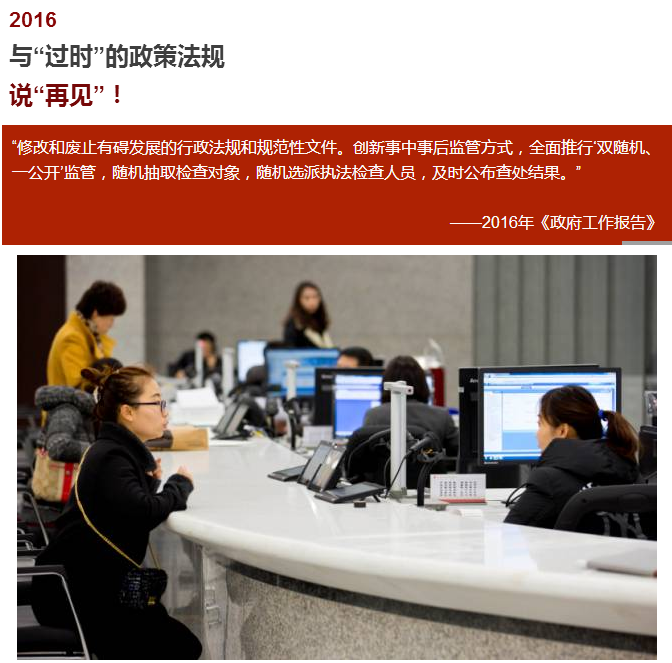 贯通职业资格、学历等认证渠道! 10月21日,国务院印发《关于激发重点群体活力带动城乡居民增收的实施意见》,指出实施技能人才激励计划,贯通职业资格、学历等认证渠道。统筹考虑技能培训、职业教育和高等教育,建立职业资格与相应的职称、学历可比照认定制度。 修改66部行政法规! 3月1日,《国务院关于修改部分行政法规的决定》公布,国务院对取消和调整行政审批项目、价格改革和实施普遍性降费措施涉及的行政法规进行了清理,决定对66部行政法规的部分条款予以修改。 宣布失效506件国务院文件! 6月30日,国务院印发《关于宣布失效一批国务院文件的决定》,《决定》指出,对不符合现行法律法规或没有法律法规依据,不适应经济发展需要、严重束缚企业生产经营和管理活动,设立的审批事项已取消或下放,或不同文件对同一事项重复要求、规定不一致等的506件国务院文件宣布失效。 10部门协同打破信息孤岛! 4月26日,国务院办公厅转发10部门《推进“互联网+政务服务”开展信息惠民试点实施方案》,提出要加快推进“互联网+政务服务”,进一步推动部门间政务服务相互衔接,协同联动,打破信息孤岛,有效解决群众办事“多头跑、重复跑、跨省跑”问题,构建方便快捷、公平普惠、优质高效的政务服务体系。 网上办事大厅让百姓少跑腿! 4月18日,国务院办公厅印发《2016年政务公开工作要点》,《要点》要求推进政务服务公开,推动政务服务事项办理由实体政务大厅向网上办事大厅延伸。 让守信者“畅行无阻”! 6月12日,国务院印发《关于建立完善守信联合激励和失信联合惩戒制度加快推进社会诚信建设的指导意见》。《意见》指出,要进一步加快推进社会信用体系建设,加强信用信息公开和共享,对诚实守信的市场主体,探索建立行政审批“绿色通道”,使守信者获得更多机会和实惠,进一步提高守信收益。 2020年全面实现“互联网+政务服务”! 9月26日,国务院印发《关于加快推进“互联网+政务服务”工作的指导意见》。2020年底前,实现互联网与政务服务深度融合,建成覆盖全国的整体联动、部门协同、省级统筹、一网办理的“互联网+政务服务”体系,让政府服务更聪明,让企业和群众办事更方便、更快捷、更有效率。 (责任编辑:admin) |